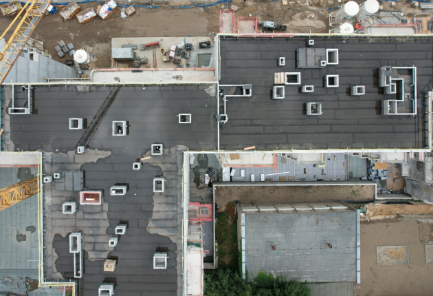 Na dachu tego budynku trwają obecnie prace dekarskie.